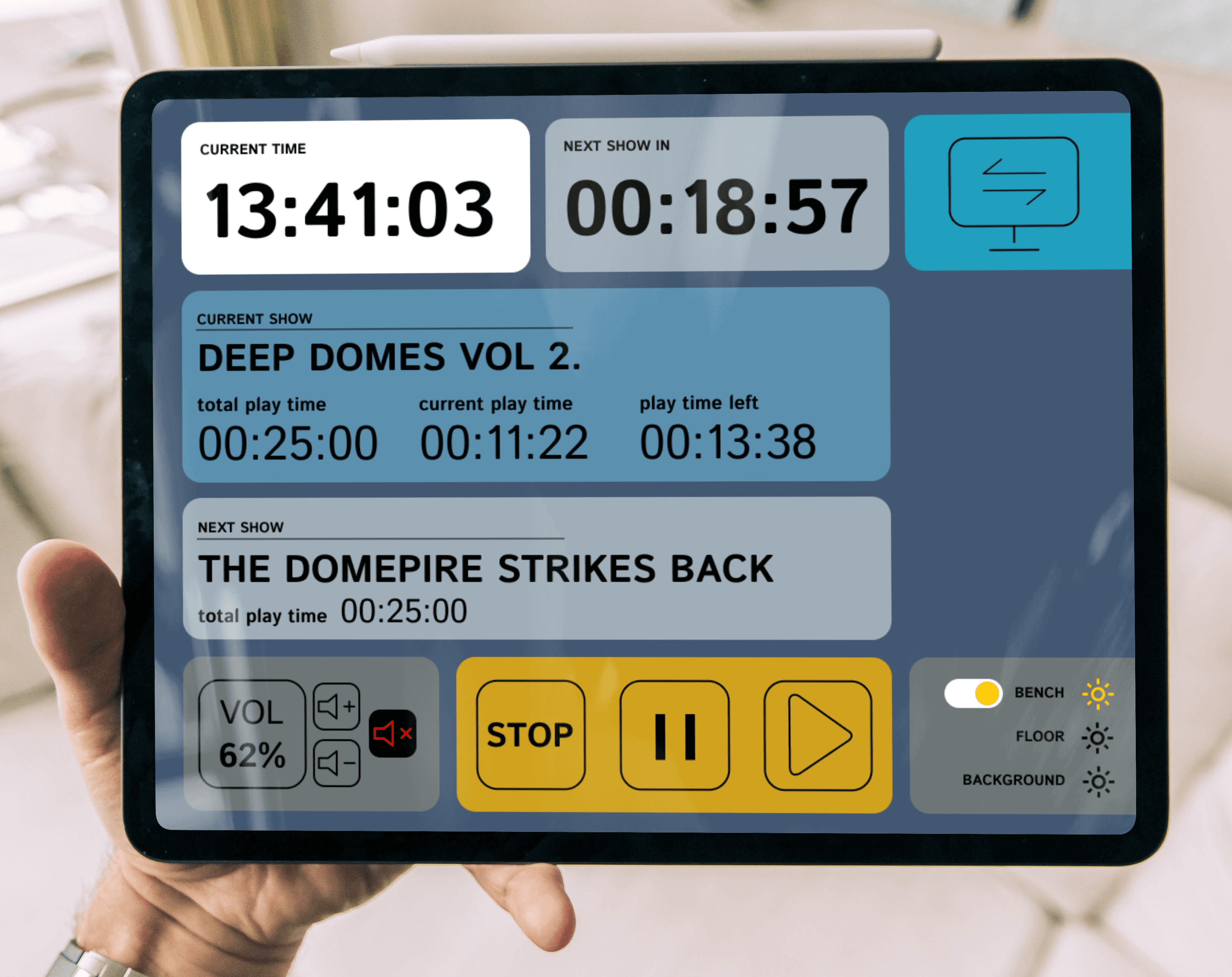 The Sound Dome at the Hungarian House of Music in Budapest is a one-of-a-kind immersive venue. With its 360-degree panoramic projection and ambisonic sound system featuring over 40 individual sources, it transforms films into full spatial experiences. As part of a major refurbishment and technical upgrade, our client Glowing Bulbs needed a custom control interface to manage daily show operations. That’s where we came in.